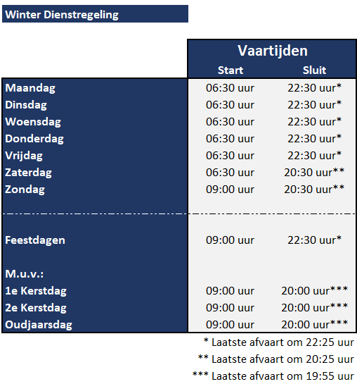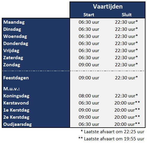 Tevens staan de afwijkende vaartijden bij feestdagen vermeld.