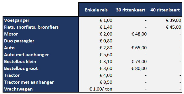 De tarieven van veerpont Culemborg staan in onderstaande overzicht weergegeven.